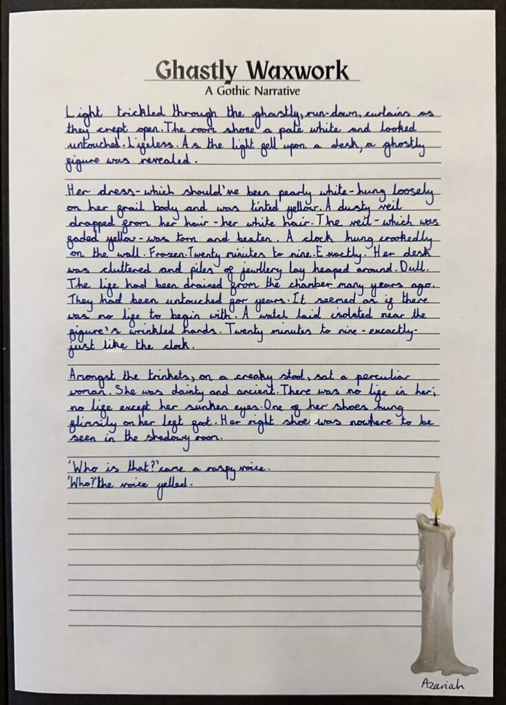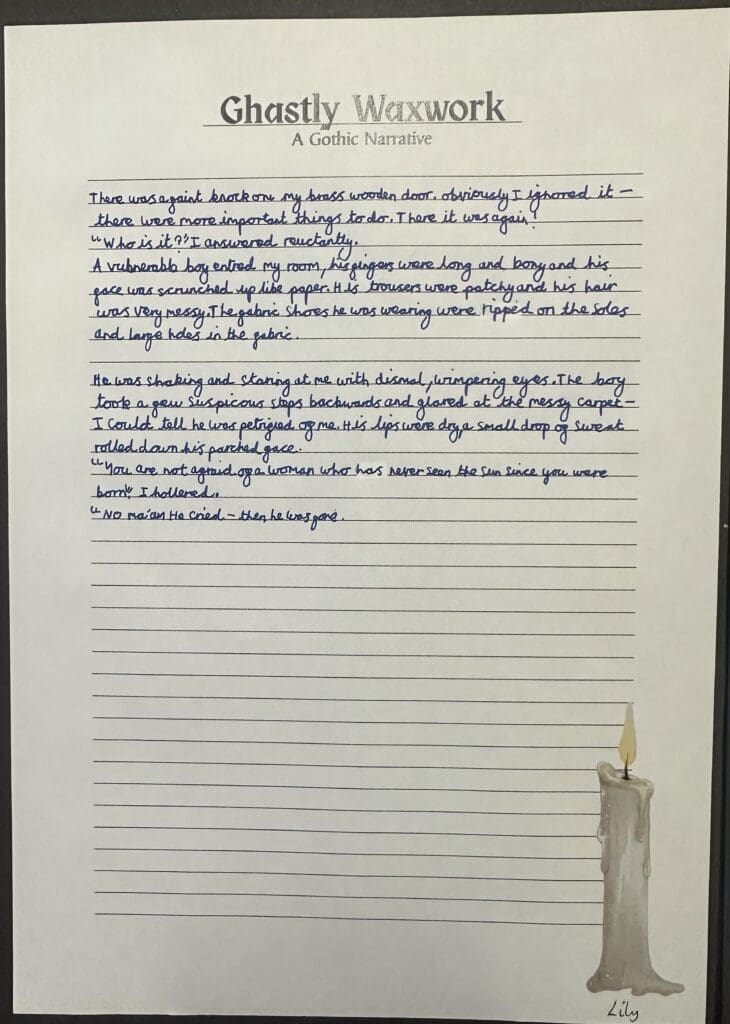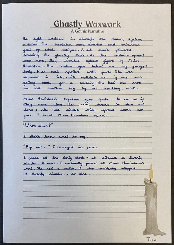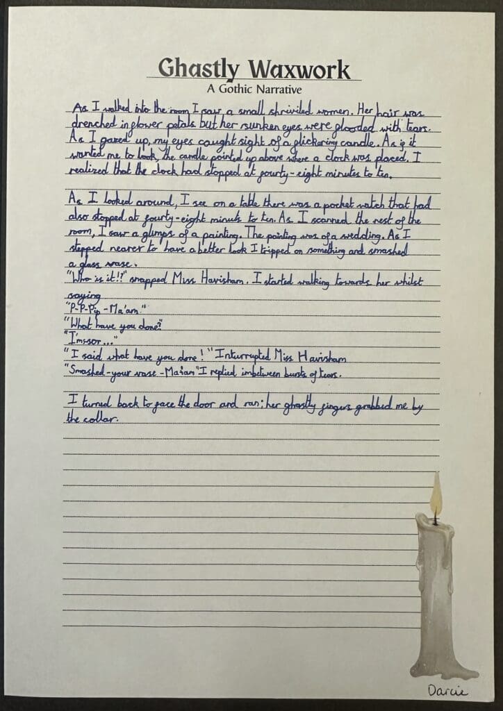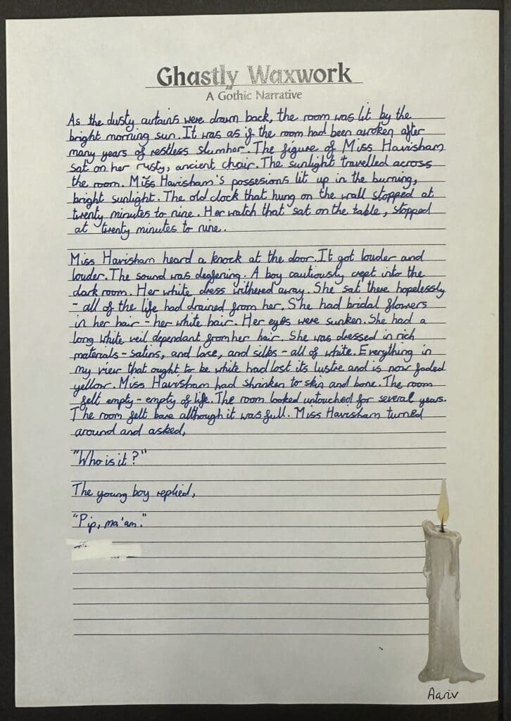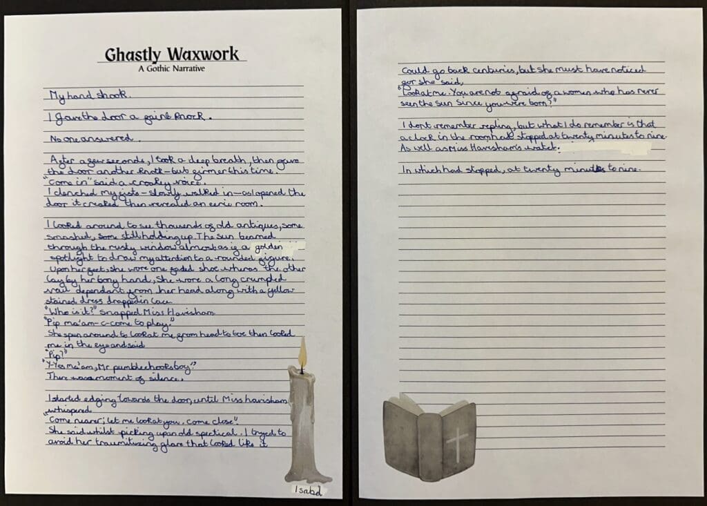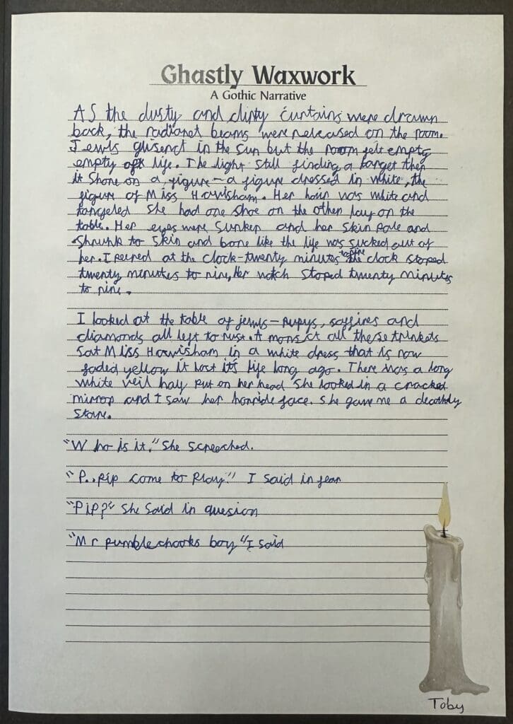 Over the last couple of weeks in Danes Class, we have been enjoying Charles Dickens’ ‘Great Expectations’. Focussing on an extract in which Pip met Miss Havisham for the first time, we were posed with the question ‘How does Dickens create a sense of horror and decay around the character of Miss Havisham?’ When writing our own pieces, we used a gothic style as well as some of the techniques used by Dickens.