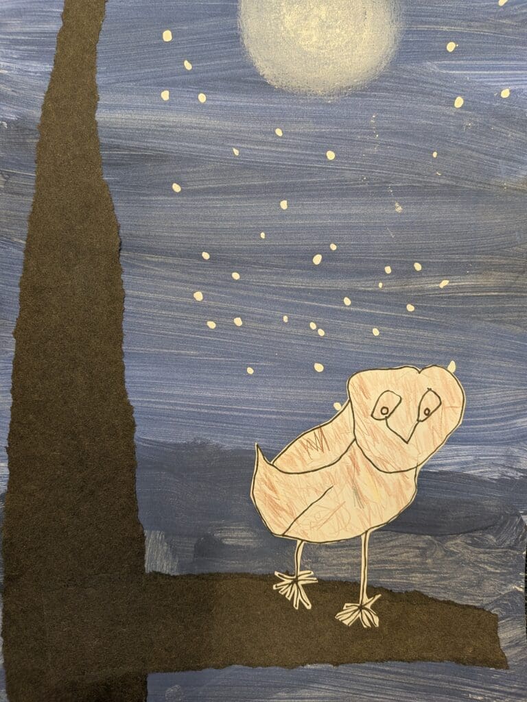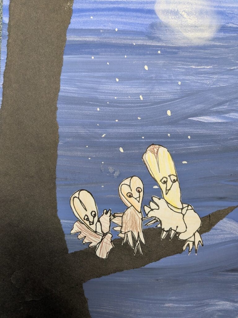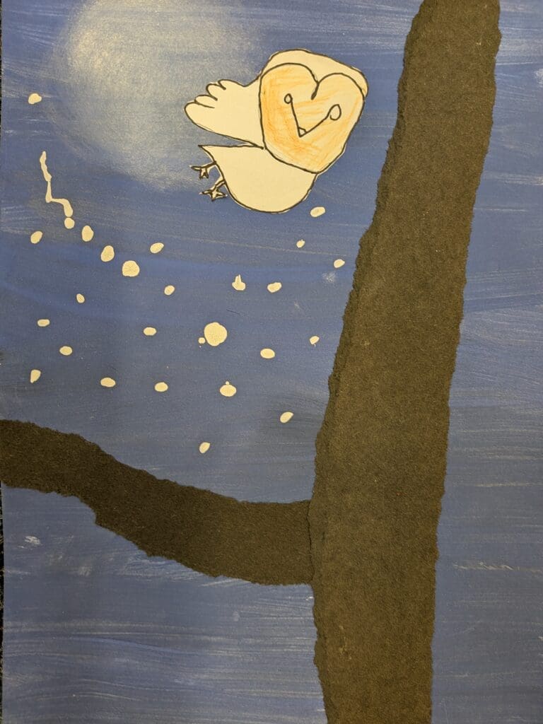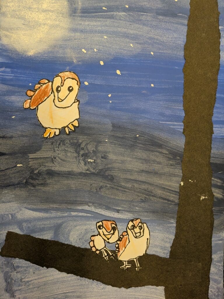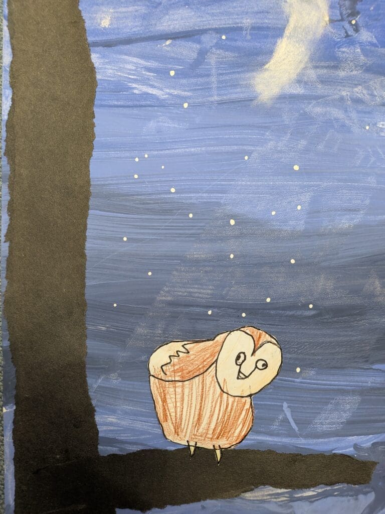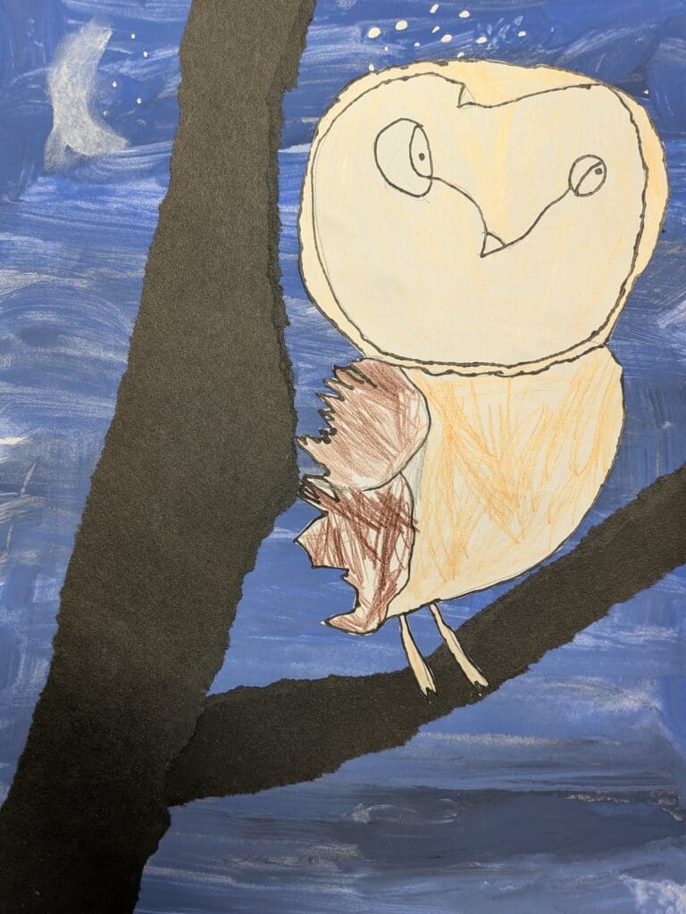 We explored lots of art skills this week. We learned how to create a dark background by colour washing the page with a range of different blues. We used chalk and chalk pens to create a moon and stars and experimented with smudging the chalk. After this we tore up black sugar paper to make a tree trunk and branch. On the final day, we watched a youtube video on how to draw a barn owl. It was very difficult and we all tried really hard to draw our wonderful owls. Everyone was really pleased with the final outcome!