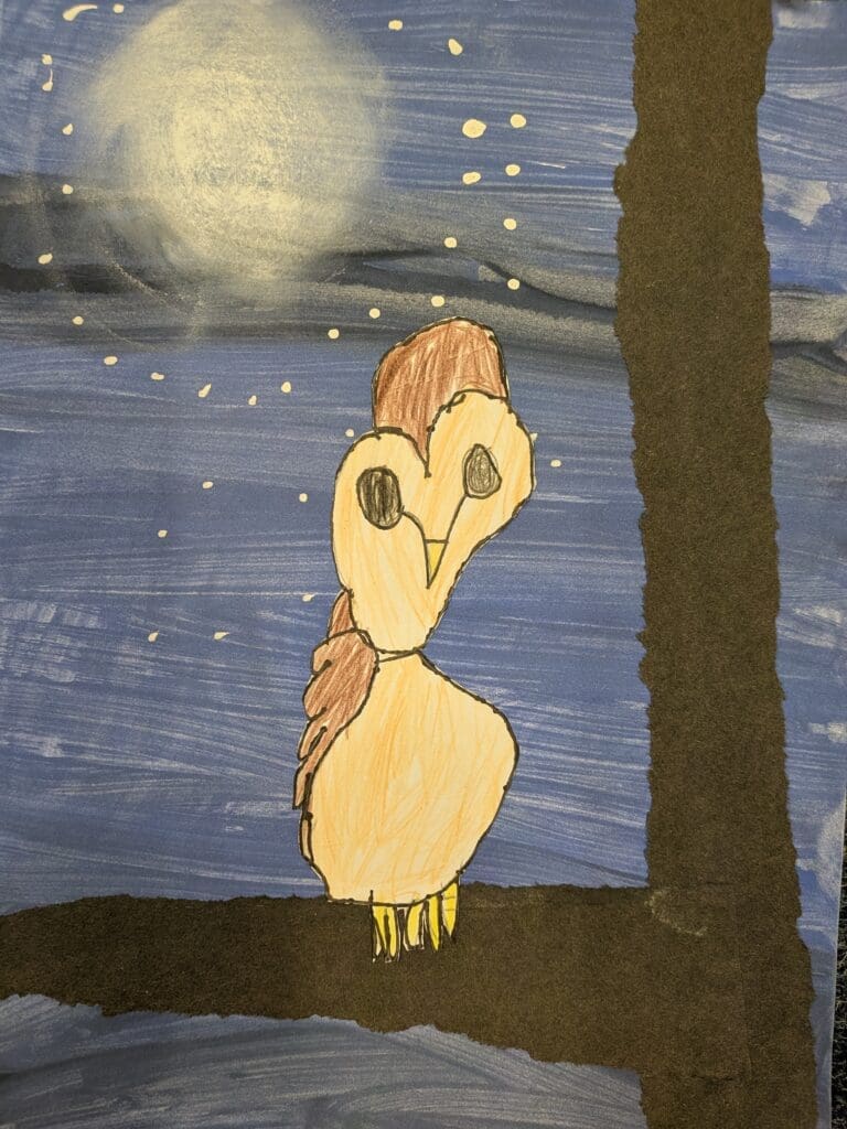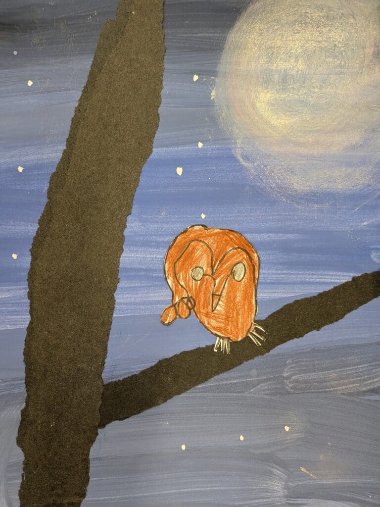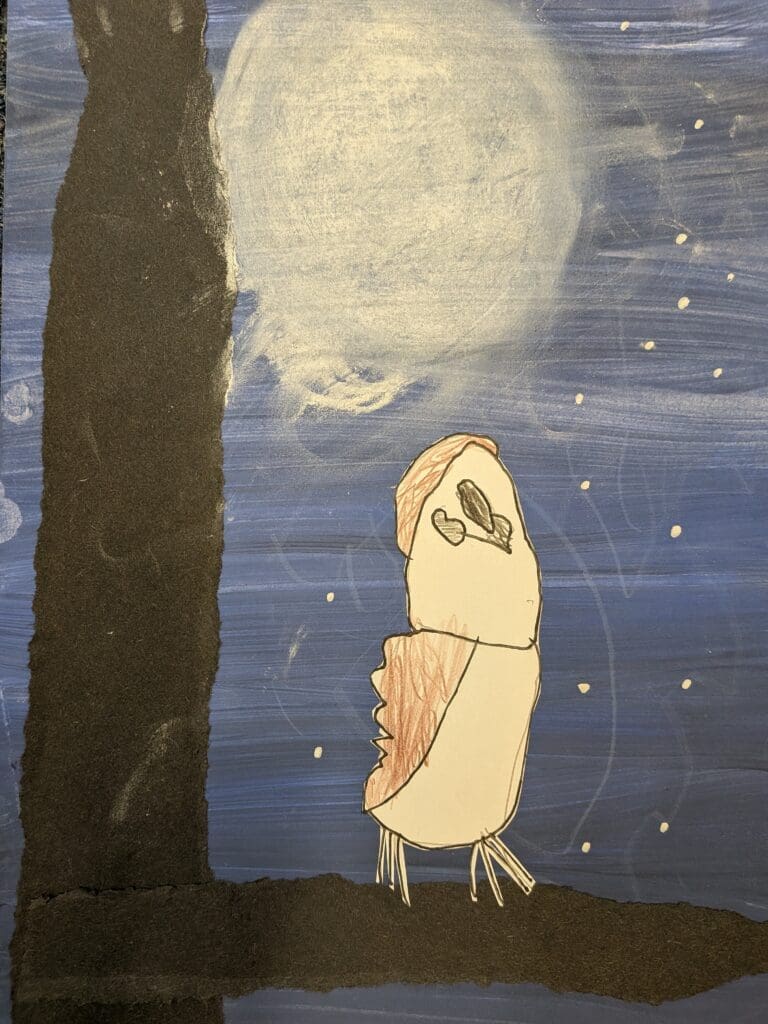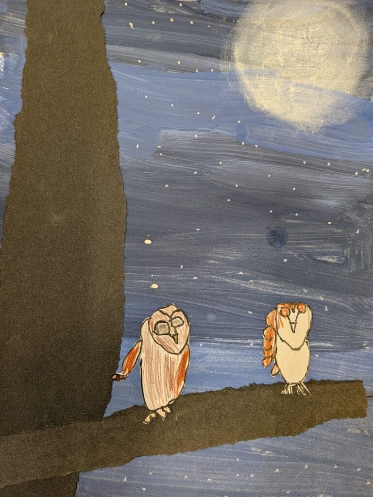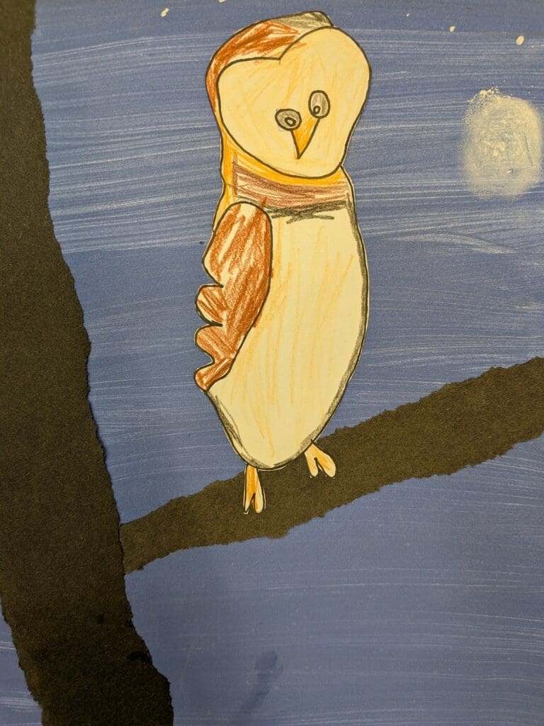 We explored lots of art skills this week. We learned how to create a dark background by colour washing the page with a range of different blues. We used chalk and chalk pens to create a moon and stars and experimented with smudging the chalk. After this we tore up black sugar paper to make a tree trunk and branch. On the final day, we watched a youtube video on how to draw a barn owl. It was very difficult and we all tried really hard to draw our wonderful owls. Everyone was really pleased with the final outcome!