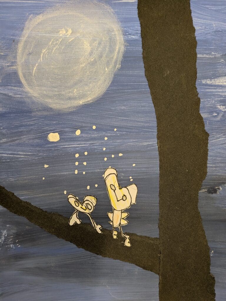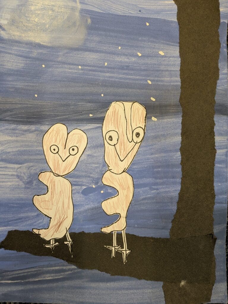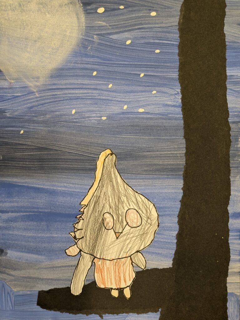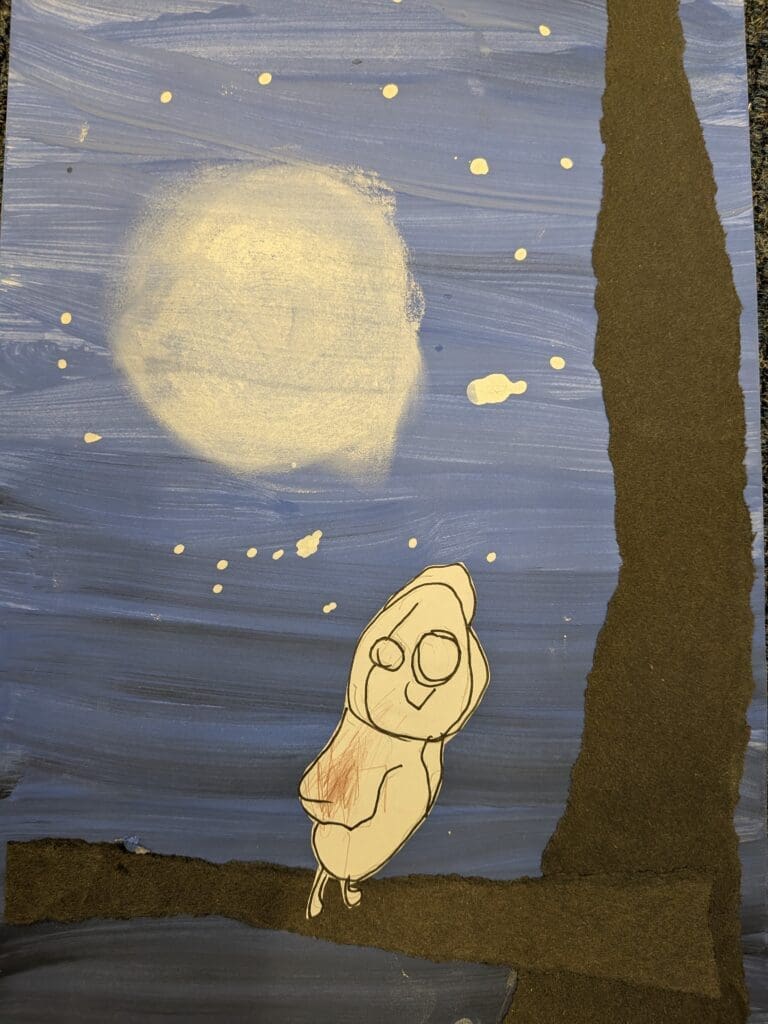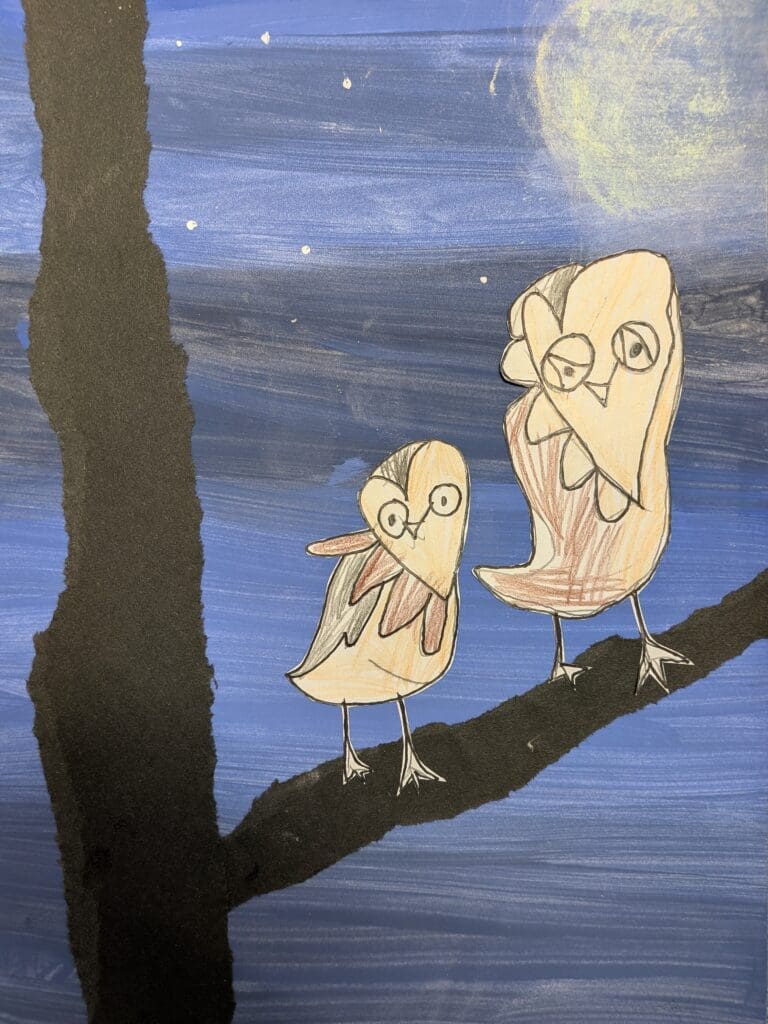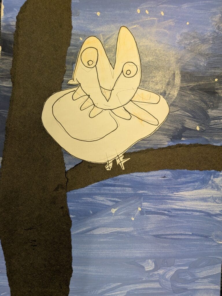 We explored lots of art skills this week. We learned how to create a dark background by colour washing the page with a range of different blues. We used chalk and chalk pens to create a moon and stars and experimented with smudging the chalk. After this we tore up black sugar paper to make a tree trunk and branch. On the final day, we watched a youtube video on how to draw a barn owl. It was very difficult and we all tried really hard to draw our wonderful owls. Everyone was really pleased with the final outcome!