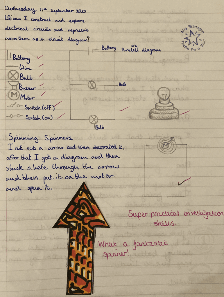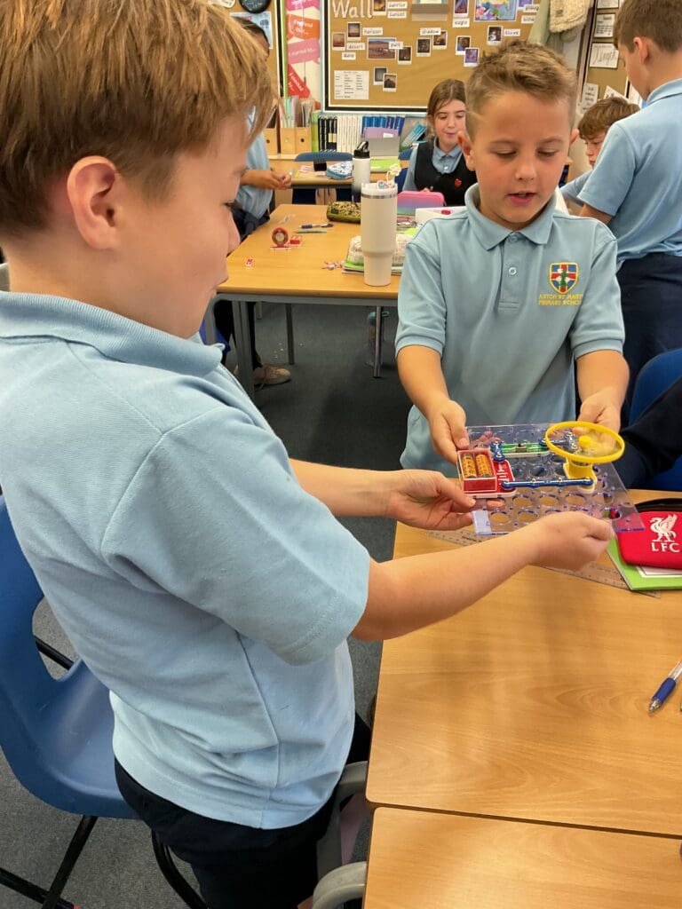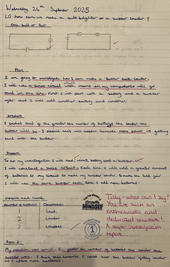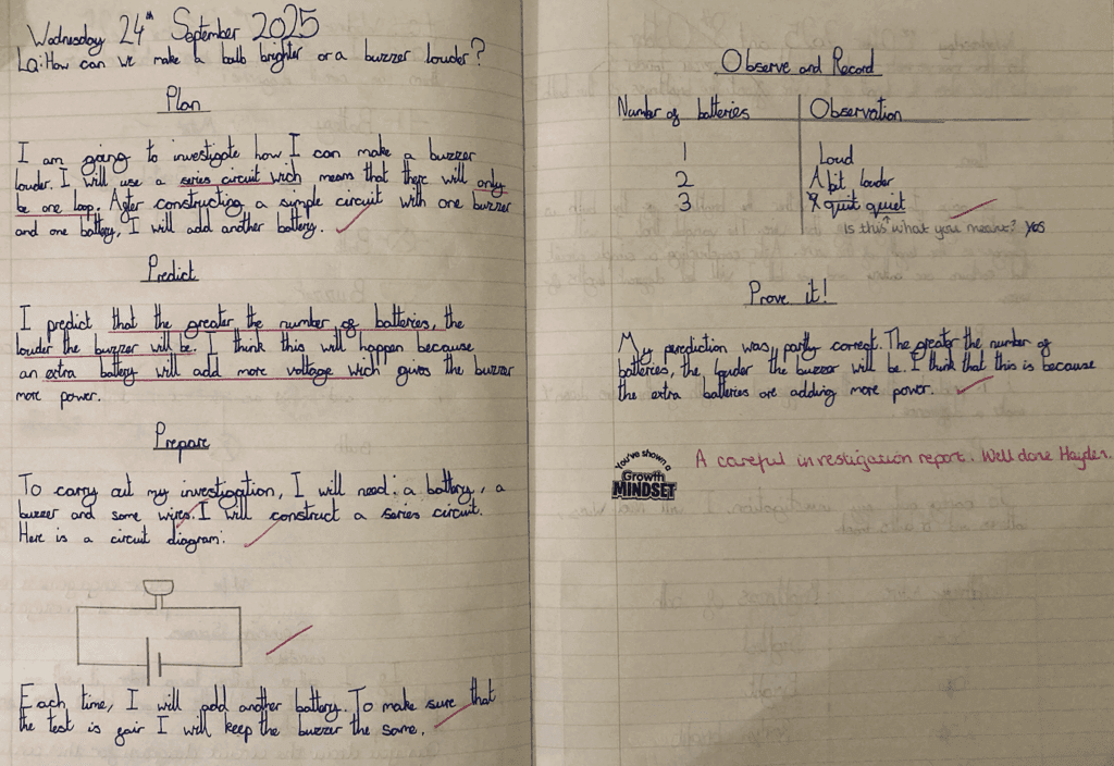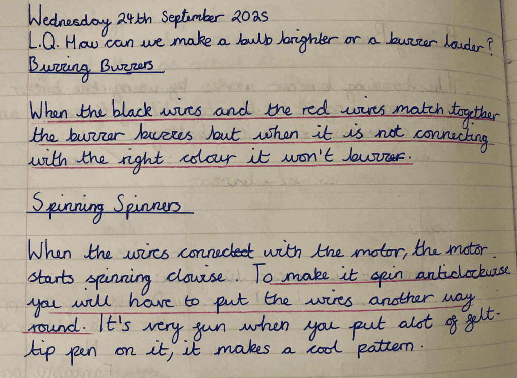 After this, we had lots of fun exploring circuits using other electrical components including motors and buzzers. As part of our learning, we have completed two PPPOP investigations – one to explore how we can make a bulb brighter or a buzzer louder and the next to explore how the length of the wire affects the brightness of a bulb. For these investigations, the children were very excited to use our electronics kits which made constructing the circuits more reliable.